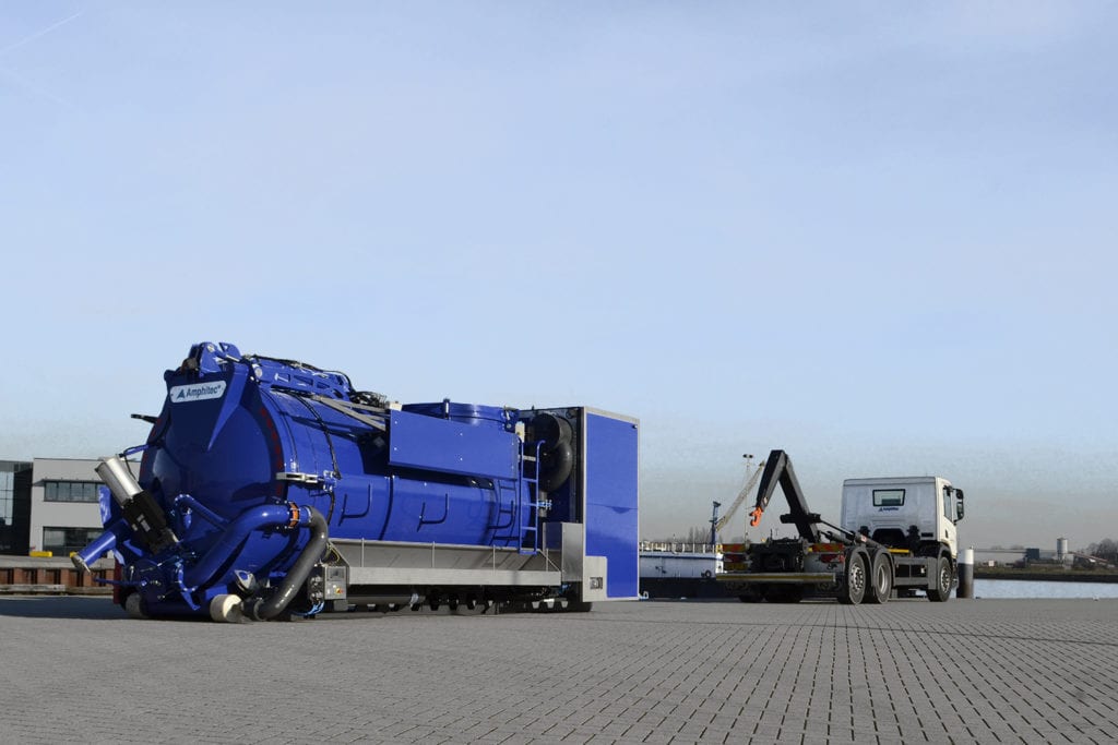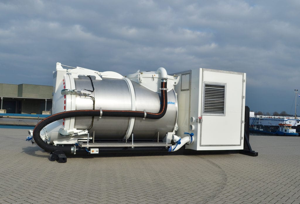 The Amphitec Flex-Loader is a stand-alone, autonomous system on a container frame for vacuuming and blowing dry and wet substances. The Flex-Loader has a compact design, but has a large tank volume. As a result, this machine excels in maximum flexibility. This system can be placed on a truck with a 20” container frame, hook arm system or cable system. The unit can be fitted with a big bag unloading system to ensure the quick and clean removal of any substance. This concept is fully autonomous and is also available as an electric unit with or without a battery pack.