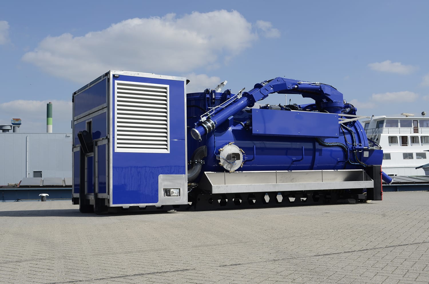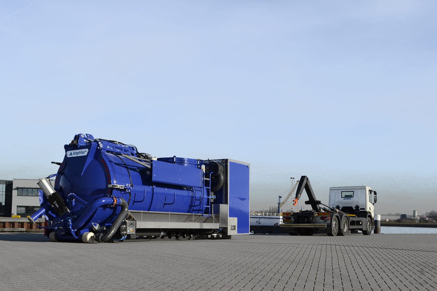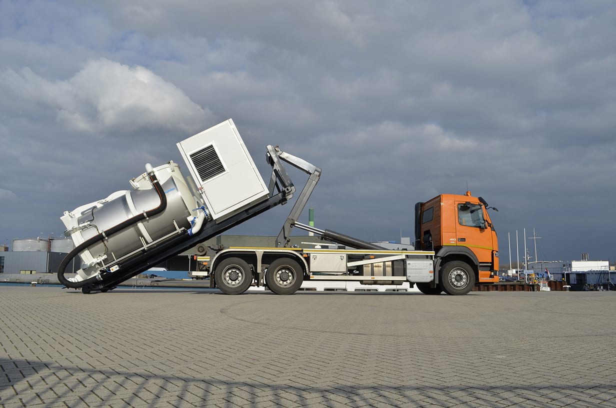 The Amphitec Flex-Loader is a stand-alone, autonomous system on a container frame for vacuuming and blowing dry and wet substances. The Flex-Loader has a compact design, but has a large tank volume. As a result, this machine excels in maximum flexibility. This system can be placed on a truck with a 20” container frame, hook arm system or cable system. The unit can be fitted with a big bag unloading system to ensure the quick and clean removal of any substance. This concept is fully autonomous and is also available as an electric unit with or without a battery pack.